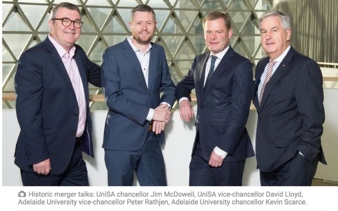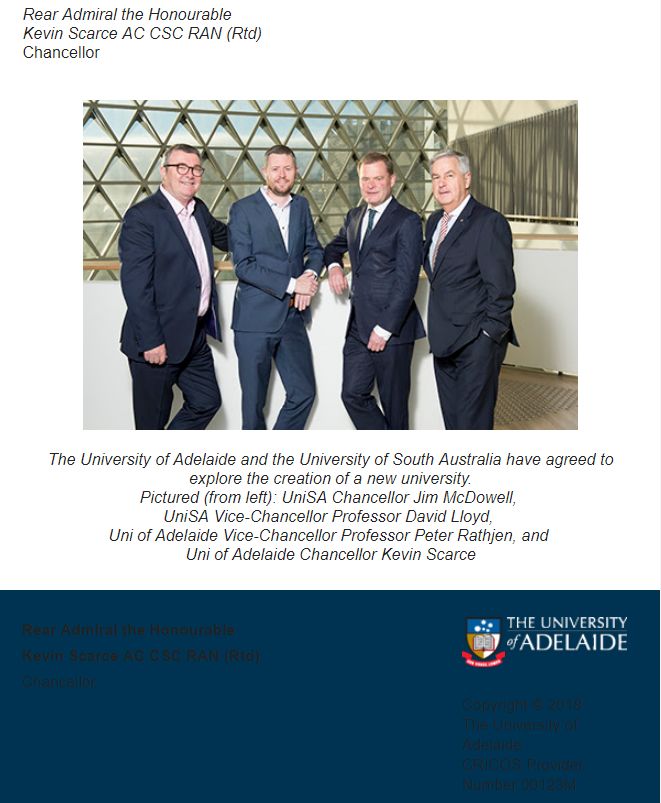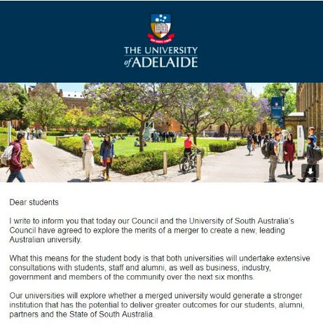现在阿德莱德大学校长Kevin Scarce和南澳大学校长Jim McDowell发表了一个联合声明:为了适应当今高速发展的教育体系,为了能够让南澳的大学在世界教育中占有一席之地,合并是最好的选择。