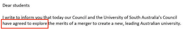 亲爱的学生们,我写此信是为了告诉你们,今天,我们和南澳大学已经同意一起研究两所大学的合并事宜,这次的合并将会创造一所全新的、顶级的澳洲大学!