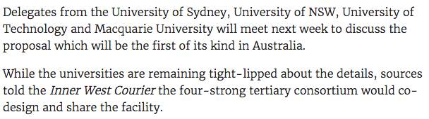 之前澳媒报道显示,这四所大学正准备组成一个联盟,建造一个类似“悉尼大学四校综合校园”的牛逼闪闪的项目!