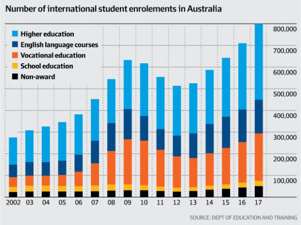 据移民局公布的数据显示。截止2018年3月初,在澳的国籍留学生人数已经达到了80万,这几乎是澳洲总人口的3.5%。且去年麦格理研究公司称,2017年澳洲GDP的10%都是由留学生贡献的。