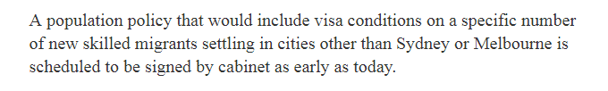 这项政策可能在昨天晚上已经交给了内阁进行签署,具体条款还没有公布,但应该包括对特定数量的技术移民添加居住城市的限制,只能选择除了墨尔本和悉尼以外的城市居住。