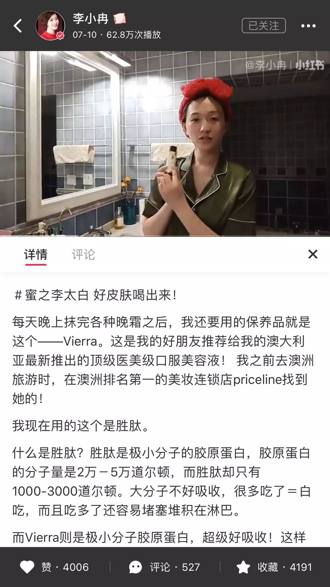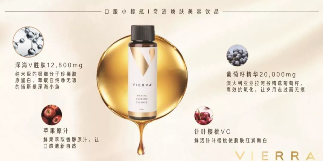 这款VIERRA的当家产品,具有抗衰老,补充胶原蛋白,去皱,抗水肿,降低黑色素生成,抗氧化的作用。